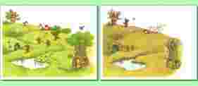 | ・絵を見て想像を広げながら、楽しく読むことができる。 ・句読点やかぎの働きに気づくことができる。 ・興味をもったことやおもしろいと思ったことを話したり、友達の発表を聞いてよさを見つけたりすることができる。 |