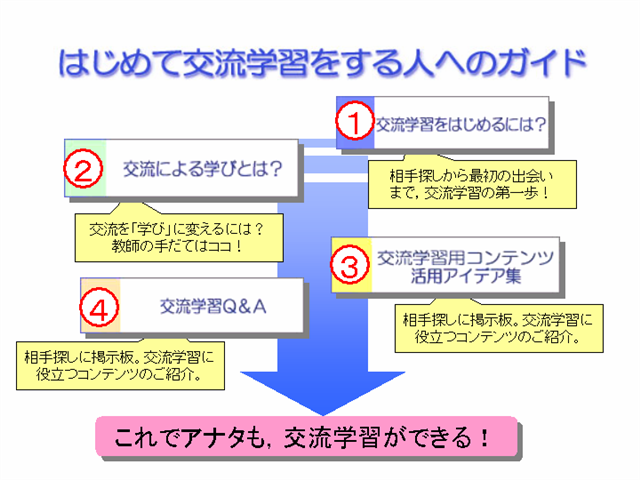 この「はじめて交流学習をする人へのガイド」では,交流学習をはじめてみようと思う先生にヒントになりそうな情報,コンテンツを紹介しています。4つのコーナーを見ることで,アナタも交流学習ができる?!