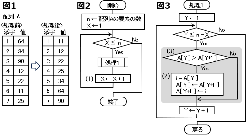 | 図1で与えられた配列Aを昇順に並べ替える処理手順を考える。 図2と図3は,その処理を行うフローチャートであり,図2中の「処理1」を詳しく記述したのが図3である。 次の説明について,【適切な語句】を,選択肢の中から選びなさい。 ・図2の(1)を初めて実行するとき,A[7]の値はとなる。 ・このフローチャートでは,もしも配列Aの一つの要素の値が。 ・図3の(2)の命令が実行される回数は,処理前の配列Aの値の並び方がなる。 ・配列Aを降順に並べたい場合は,図3の(3)の条件式をに変更するとよい。 ・この並べ替えの方式を一般に,と呼ぶ。 | |